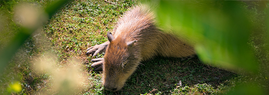 It is a nocturnal animal which prefers to shelter in a muddy den during the day. Capybaras have many predators such as jaguars and caymans, but also humans, who hunt them for their hide and flesh. They live in small groups of around 10 individuals, managed by the dominant male. They find food in the area around their den. They use their powerful incisors to cut through plants and roots.